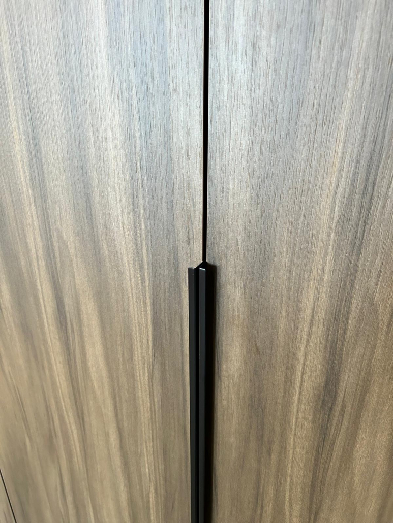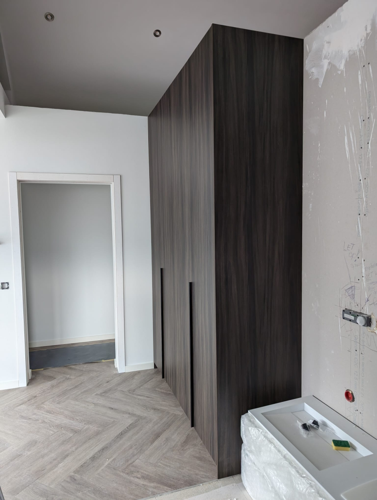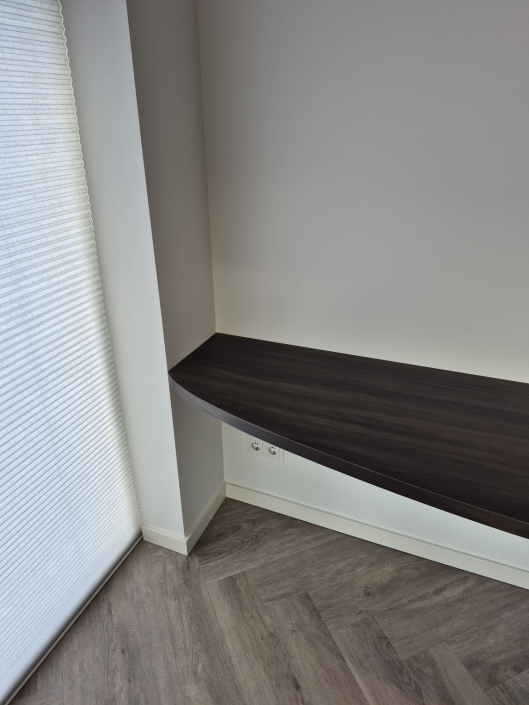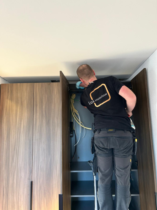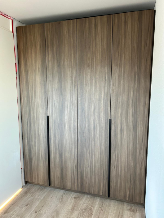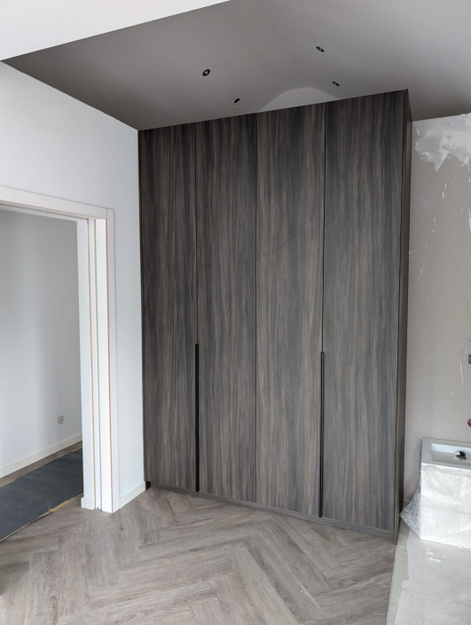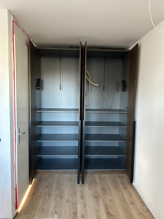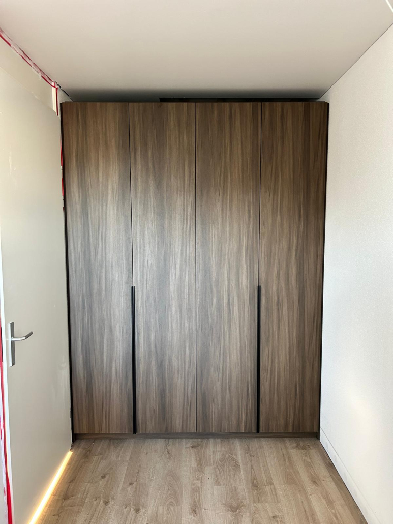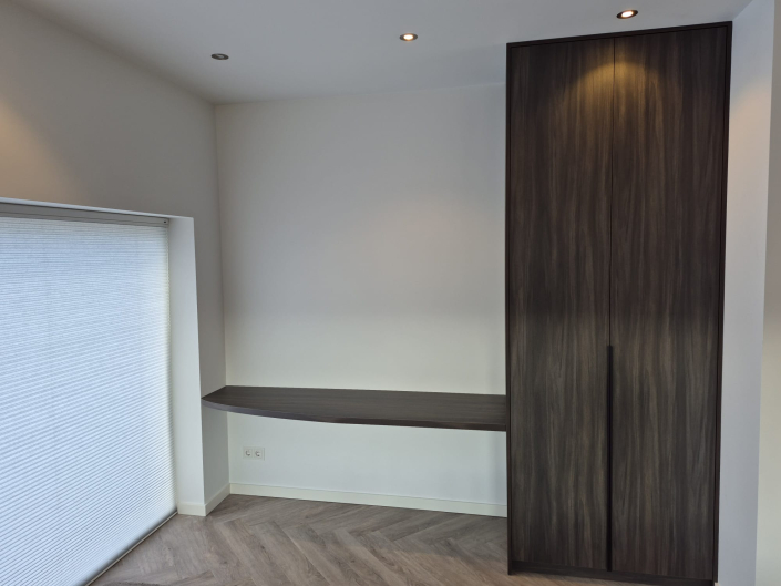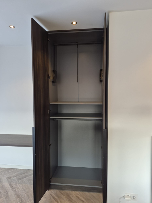 In Beuningen realiseerden we twee luxe kledingkasten op maat, elk uitgevoerd in een unieke houtstructuur. Door het combineren van verschillende houttinten ontstaat een stijlvol contrast dat warmte en elegantie uitstraalt. De kasten zijn volledig afgestemd op de ruimte en voorzien van een praktische indeling met legplanken, hanggedeeltes en geïntegreerde lades. Met een strak design en hoogwaardige afwerking vormen deze kasten een tijdloze toevoeging aan het interieur.