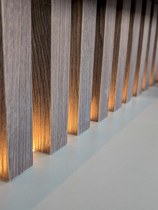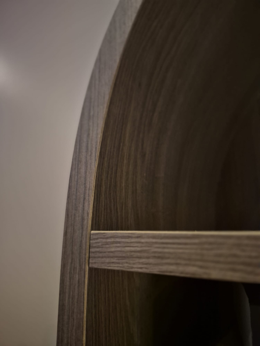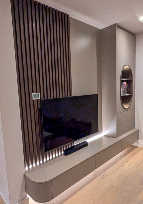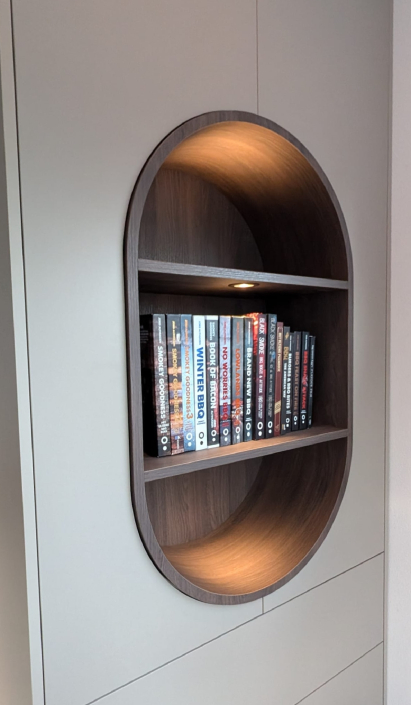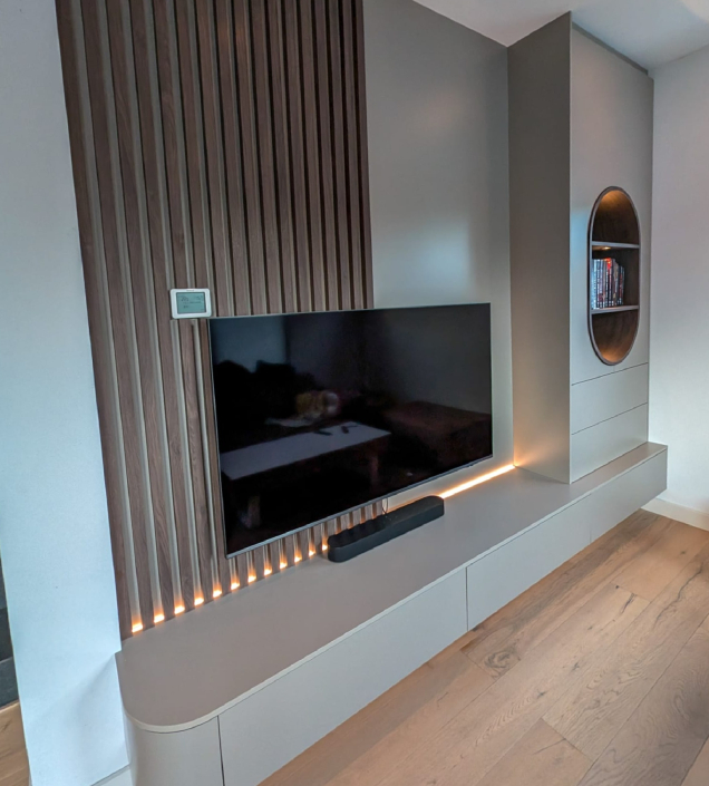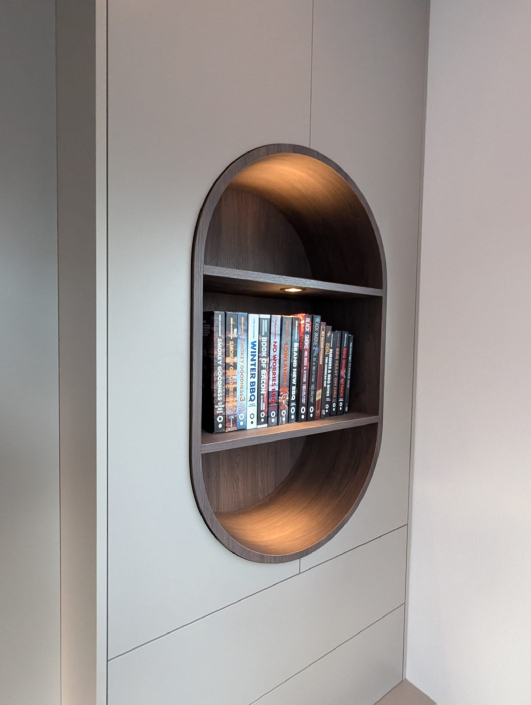 Voor een woning in Groesbeek ontwierpen en plaatsten we dit unieke tv-meubel op maat. De combinatie van lichte fronten met donker houten accenten zorgt voor een krachtig contrast en een moderne uitstraling. Bijzonder detail is de organische, ovaal gevormde nis die het meubel een speels karakter geeft én ruimte biedt voor decoratie. Het meubel is strak geïntegreerd in de wand en voorzien van handige opbergruimte met greeploze afwerking.