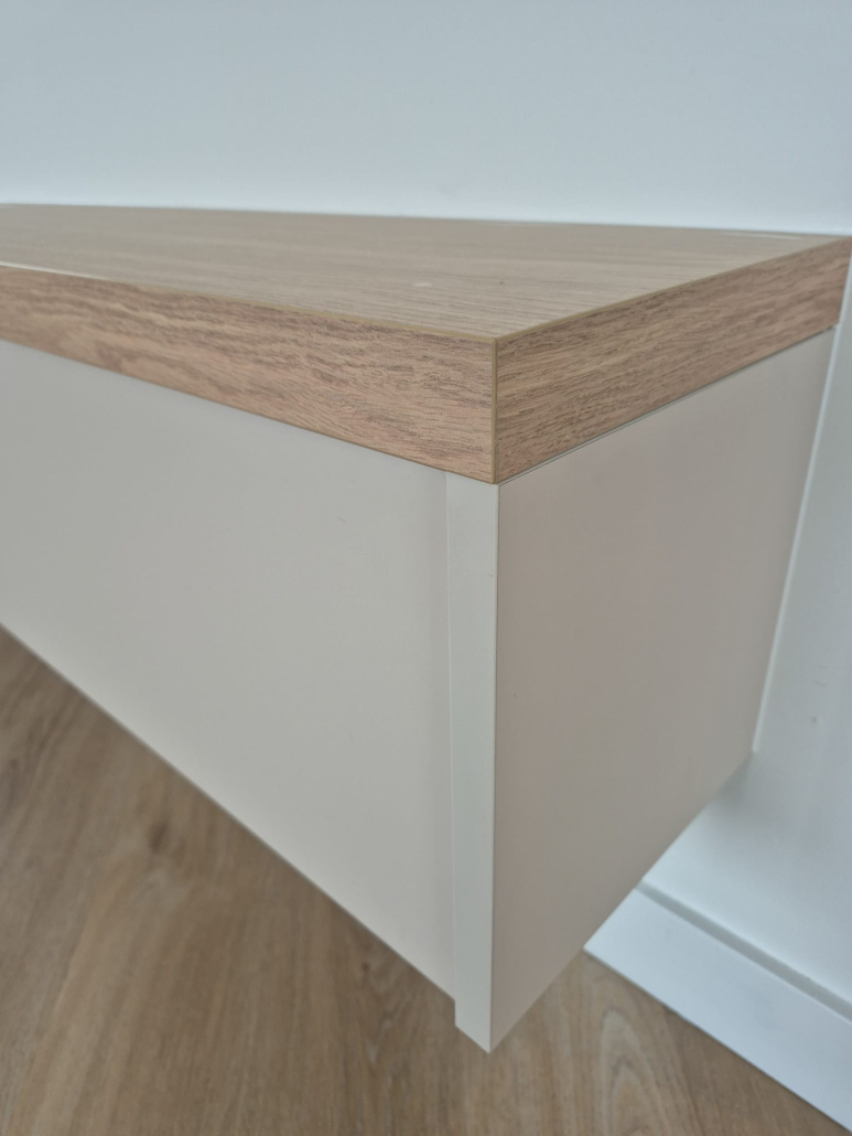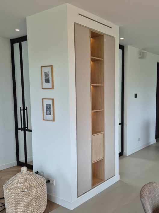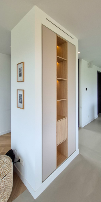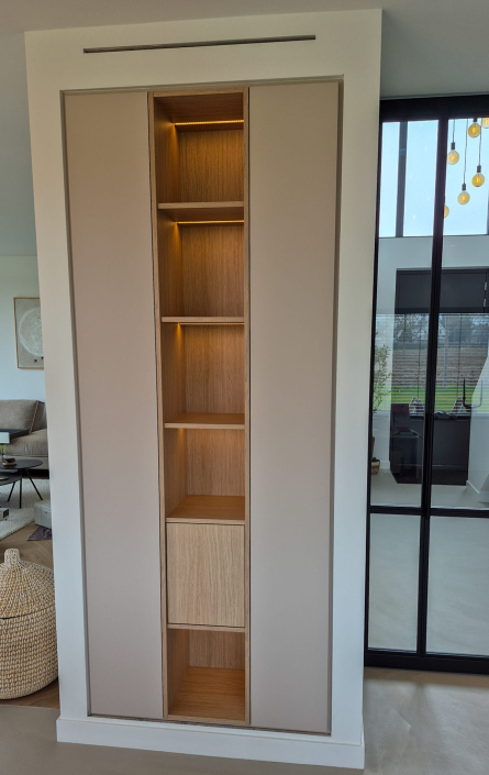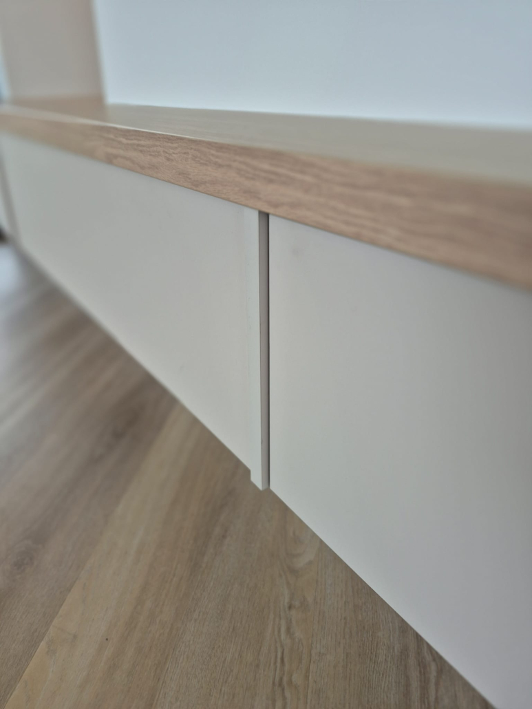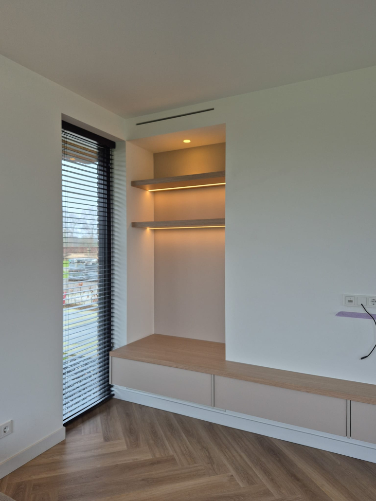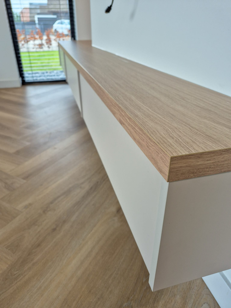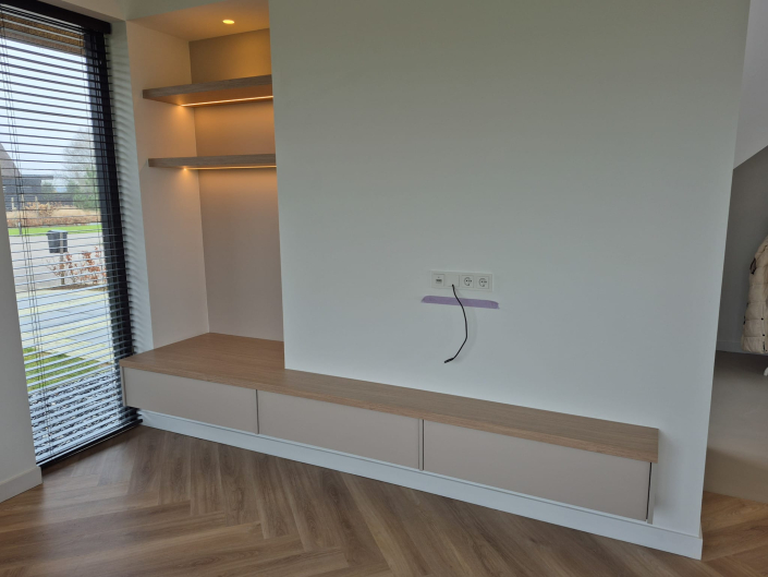 In Andelst realiseerden we een stijlvol tv-meubel gecombineerd met een bijpassende niskast, volledig op maat gemaakt. De warme beige kleur in combinatie met natuurlijke eiken accenten zorgt voor een moderne en rustige uitstraling in de woonkamer. De subtiele nis biedt ruimte voor decoratieve items, terwijl het meubel voldoende opbergruimte biedt en strak is afgewerkt zonder zichtbare grepen. Een perfect voorbeeld van maatwerk waarin esthetiek en functionaliteit samenkomen.
